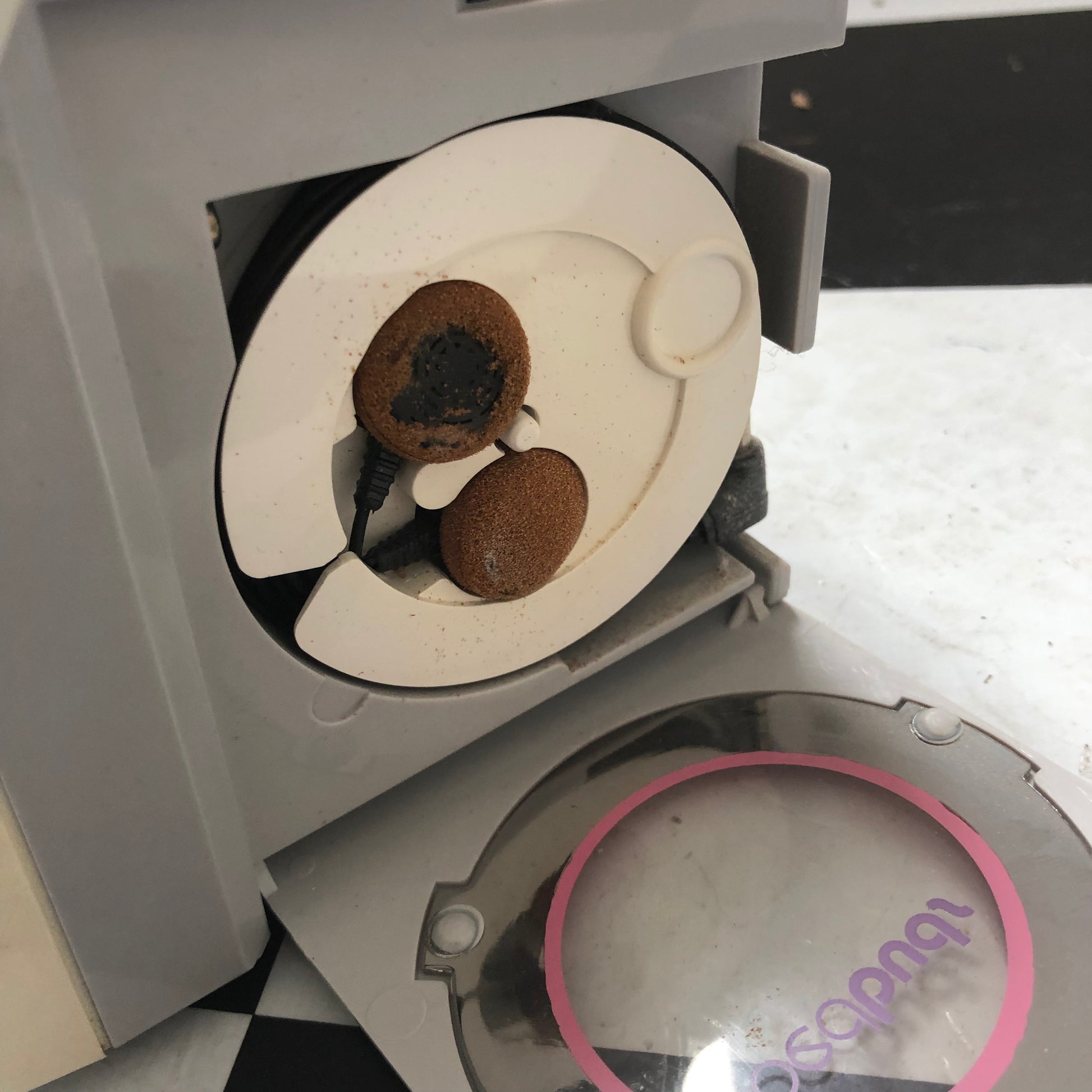condition: 7/10: slight yellowing and discoloration due to age. Headphones are damaged